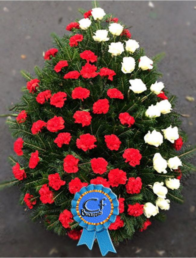 Coroana funerara realizata din Garoafe rosii cu diagonala din Trandafiri albi.