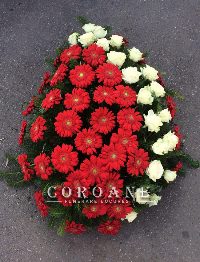 Coroana funerara realizata din Gerbera cu diagonala din Trandafiri. Aceasta coroana de flori poate fi realizata si din Gerbera si Trandafiri de alta culoare.