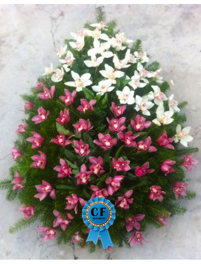 Coroana Funerara realizata din Orhidee Imperiala 2 culori, Alb jumatate si Roz jumatate.
