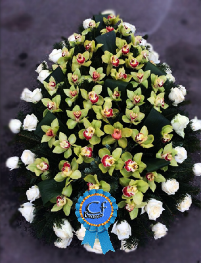 Coroana funerara realizata din Trandafiri albi pe margine cu Orhidee Imperiala verde pe mijloc.