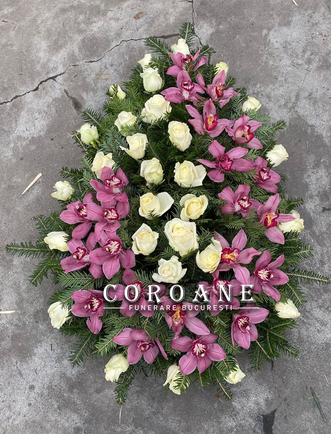Coroana funerara alcatuita din Trandafiri albi si diagonala din Orhidee mov.